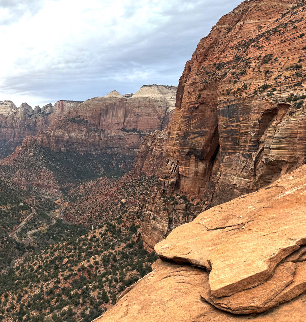The trail begins just east of the Zion–Mt. Carmel Tunnel and follows a mix of slickrock, carved steps, and a few short sections with railings. It’s an easy-to-follow path that keeps things interesting without feeling difficult.